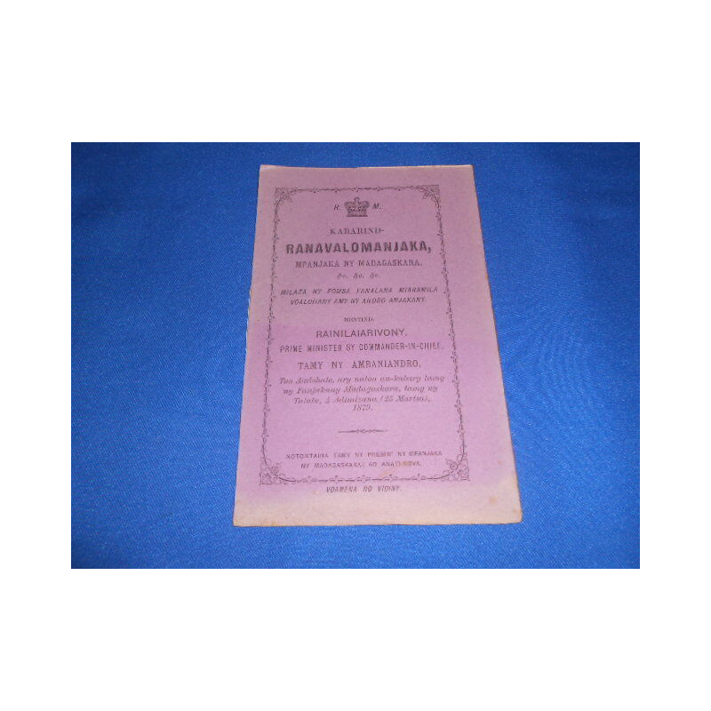 Kabarind RANAVALOMANJAKA MPANJAKA NY MADAGASKARA MILAZA NY FOMBA FANALANA MIARAMILA VOALOHANY AMY NY ANDRO ANJAKANY. RAINILAIARIVONY PRIME MINISTER SY COMMANDER IN CHIEF. TAMY NY AMBANIANDRO. Tuo Ando