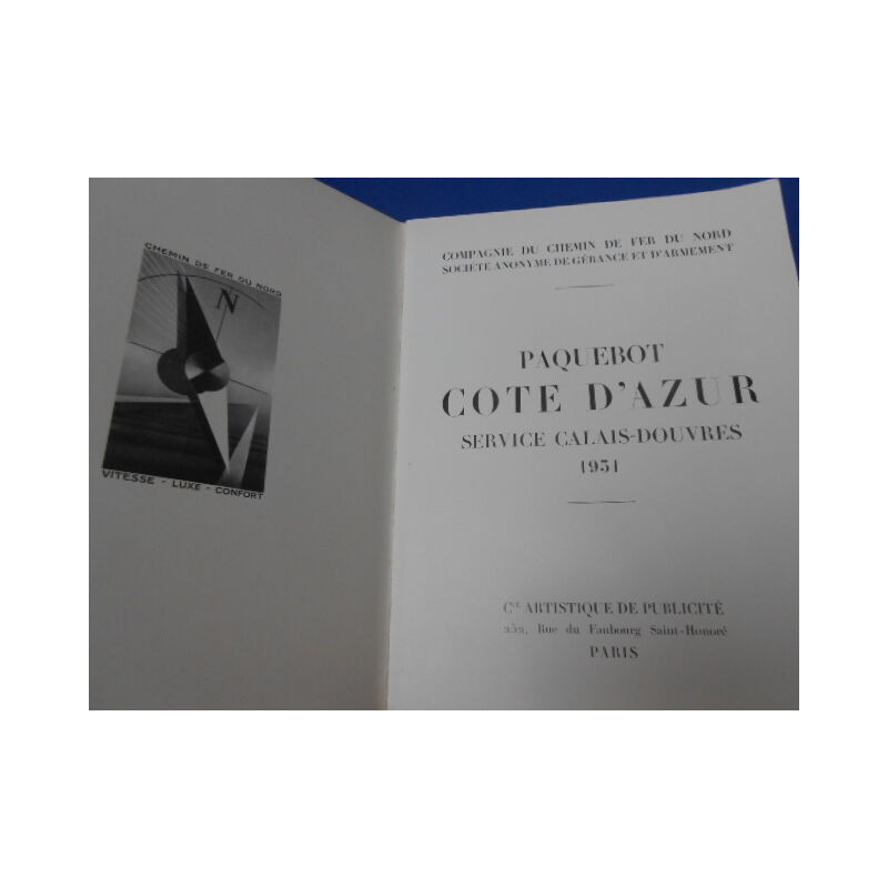 PAQUEBOT. Cote d'Azur. Service Calais-Douvres 1931. Compagnie du Chemin de Fer du Nord . Société Anonyme de Gérance et d'Armement